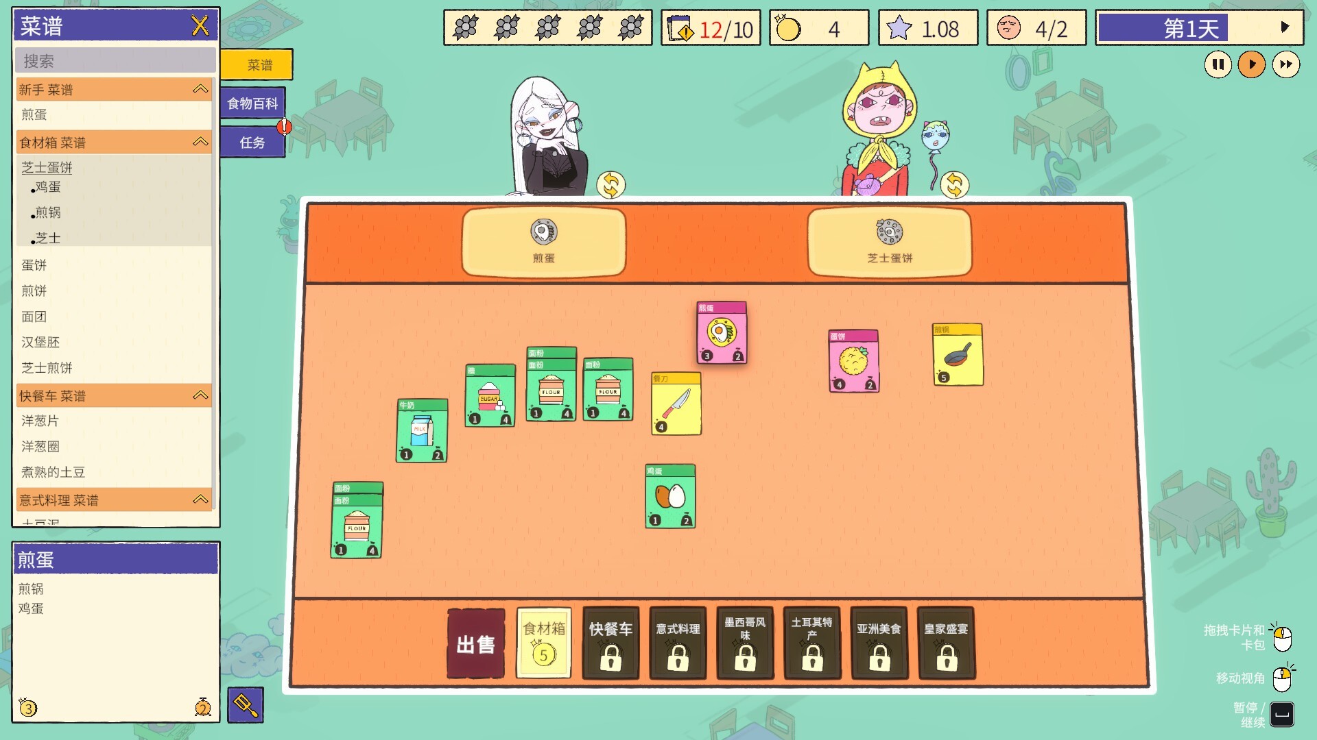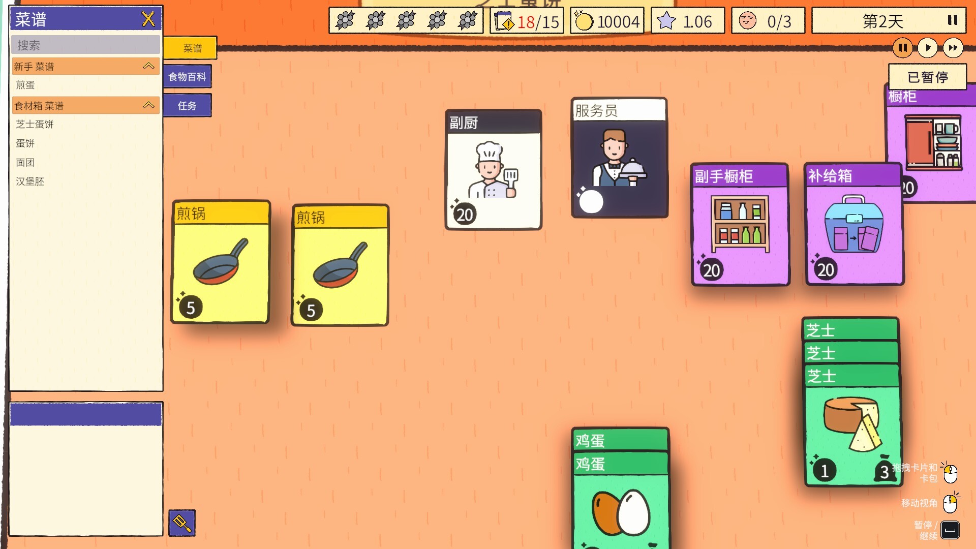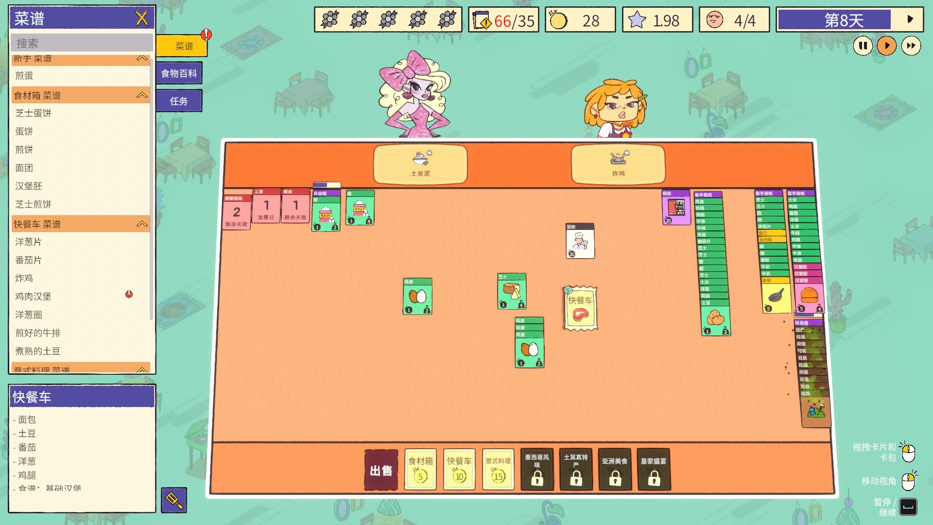 游戏主题:烹饪,卡牌游戏,温馨惬意,策略,时间管理,模拟,休闲,极简主义